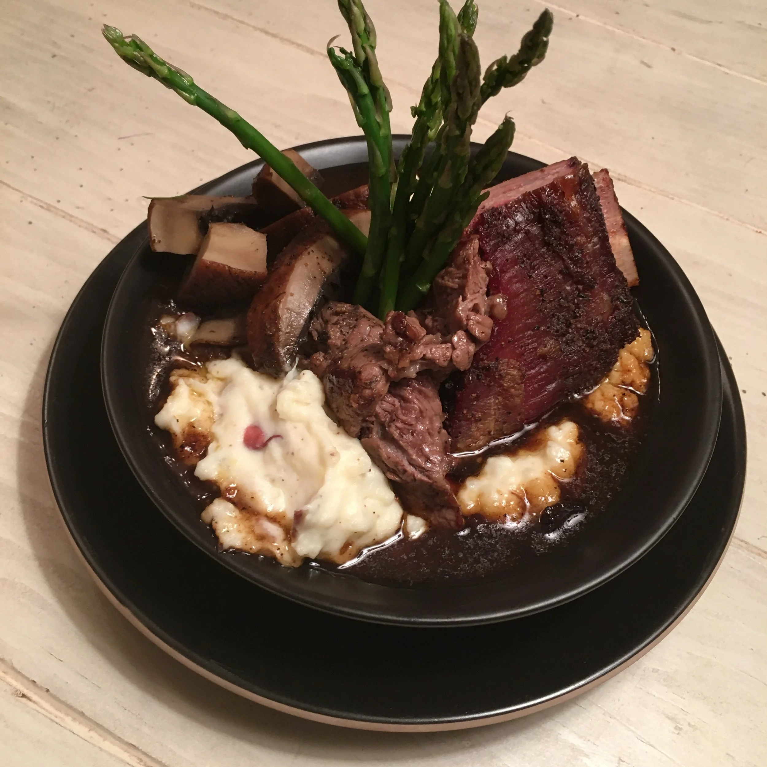 Duo of Beef with Garlic Mashed, Asparagus, Portobello & Demi Glaze